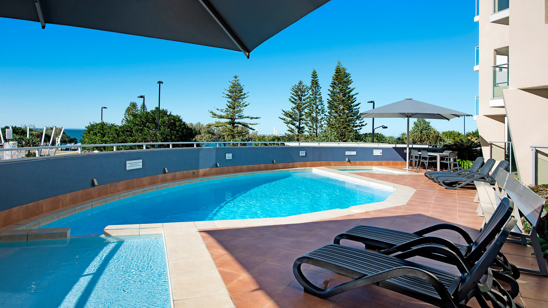 Outdoor swimming pool area with sun loungers and shaded seating.